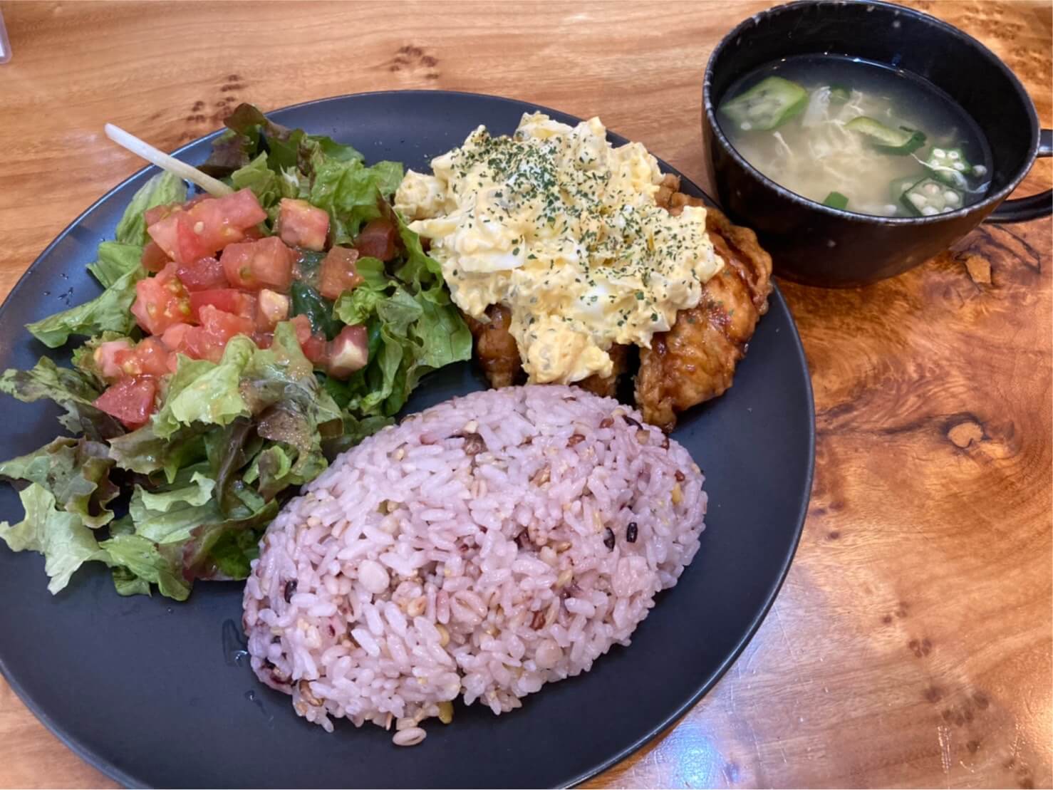 Chicken Nanban Plate Lunch (with soup) — 1,280 yen (a Kyushu specialty: crispy fried chicken with sweet vinegar sauce and tartar)