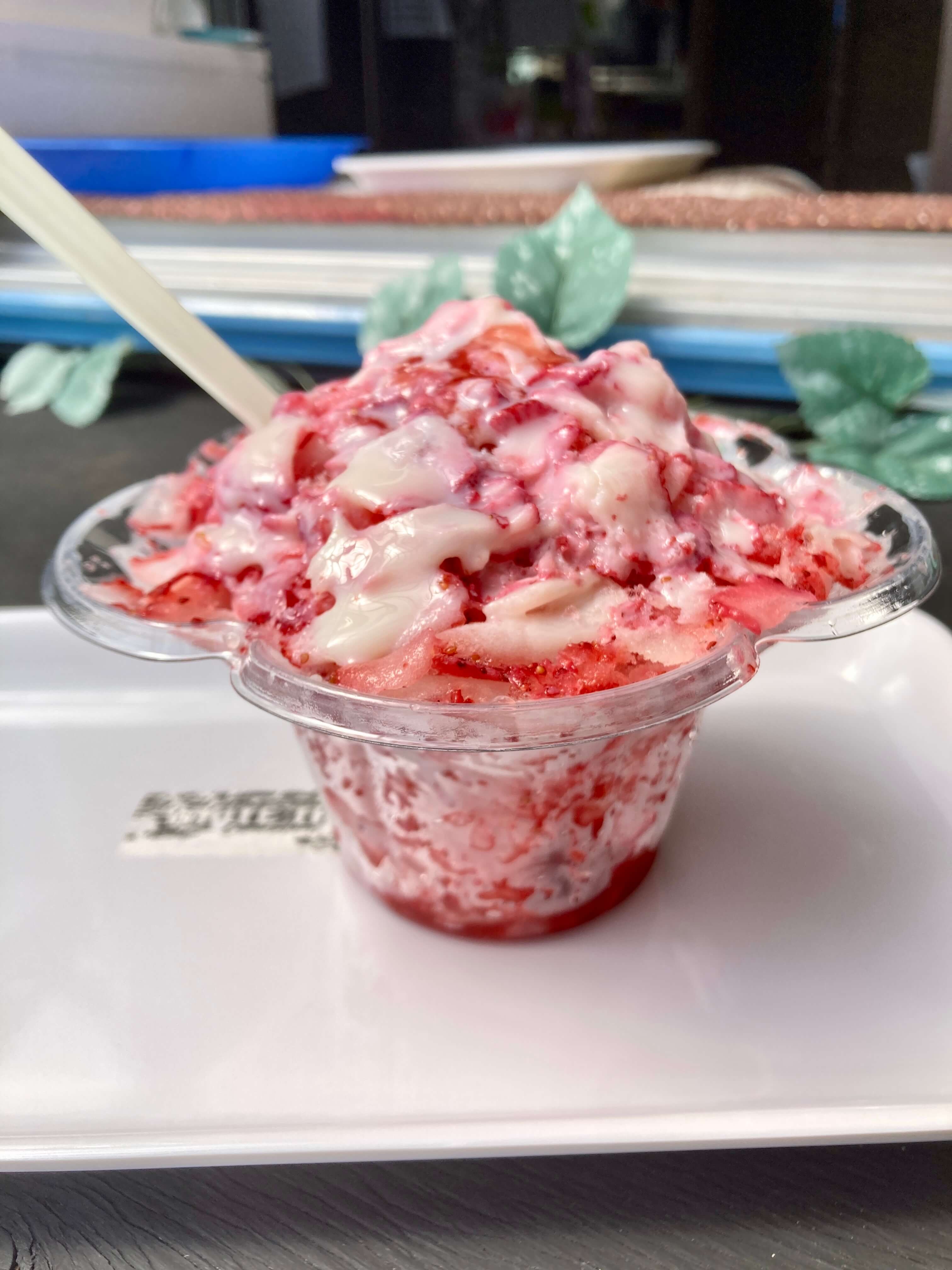 The frozen strawberries are shaved into a snow-like texture, and there’s nothing in this dessert except pure strawberries — both on top and underneath!