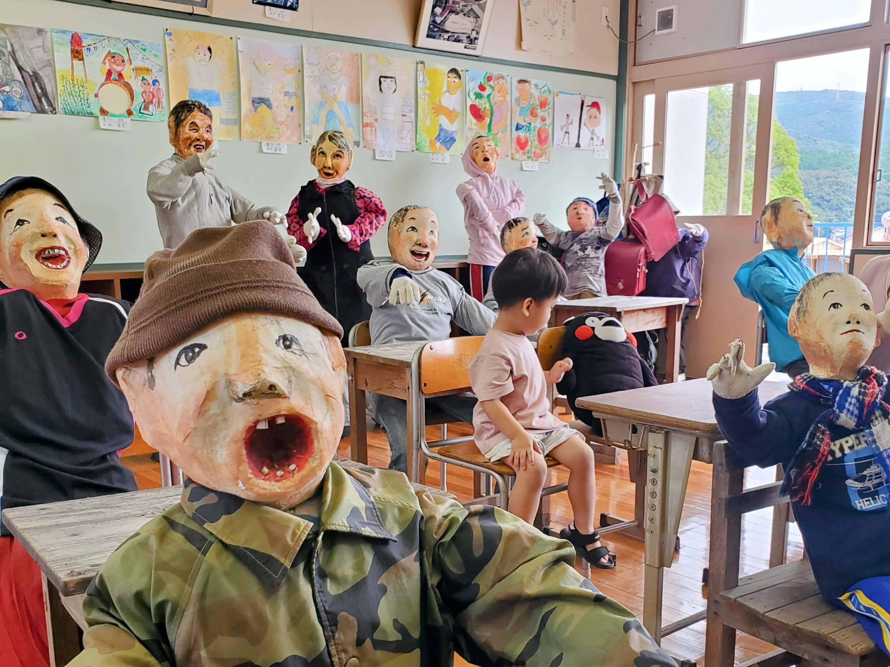 The next classroom over recreates a traditional Japanese festival scene β complete with mikoshi (portable shrine) bearers β and shows the scarecrow-making process.