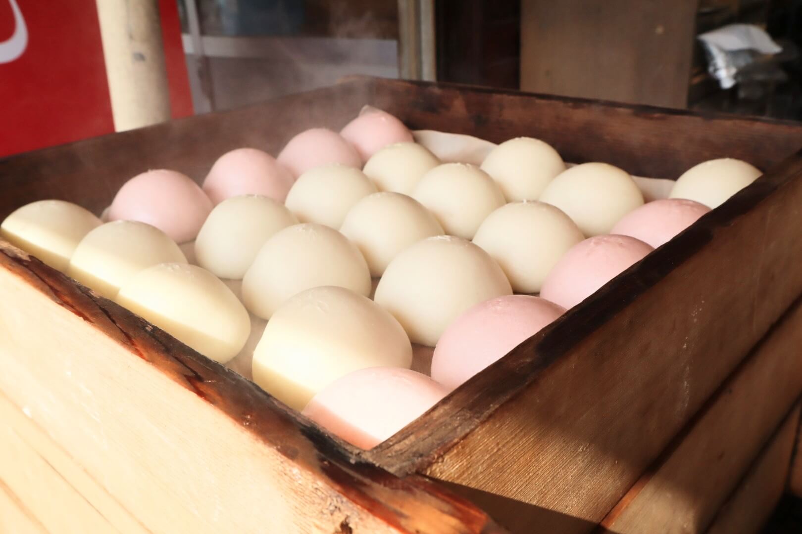 The moment the lid was lifted, the most adorable pink and white manju (Japanese steamed buns) emerged, all soft and fluffy.
