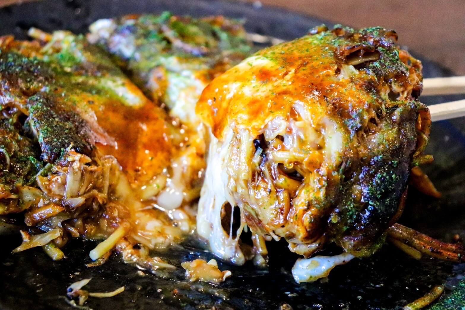 Modanyaki is a Kansai-style okonomiyaki combined with yakisoba noodles—two beloved dishes in one!