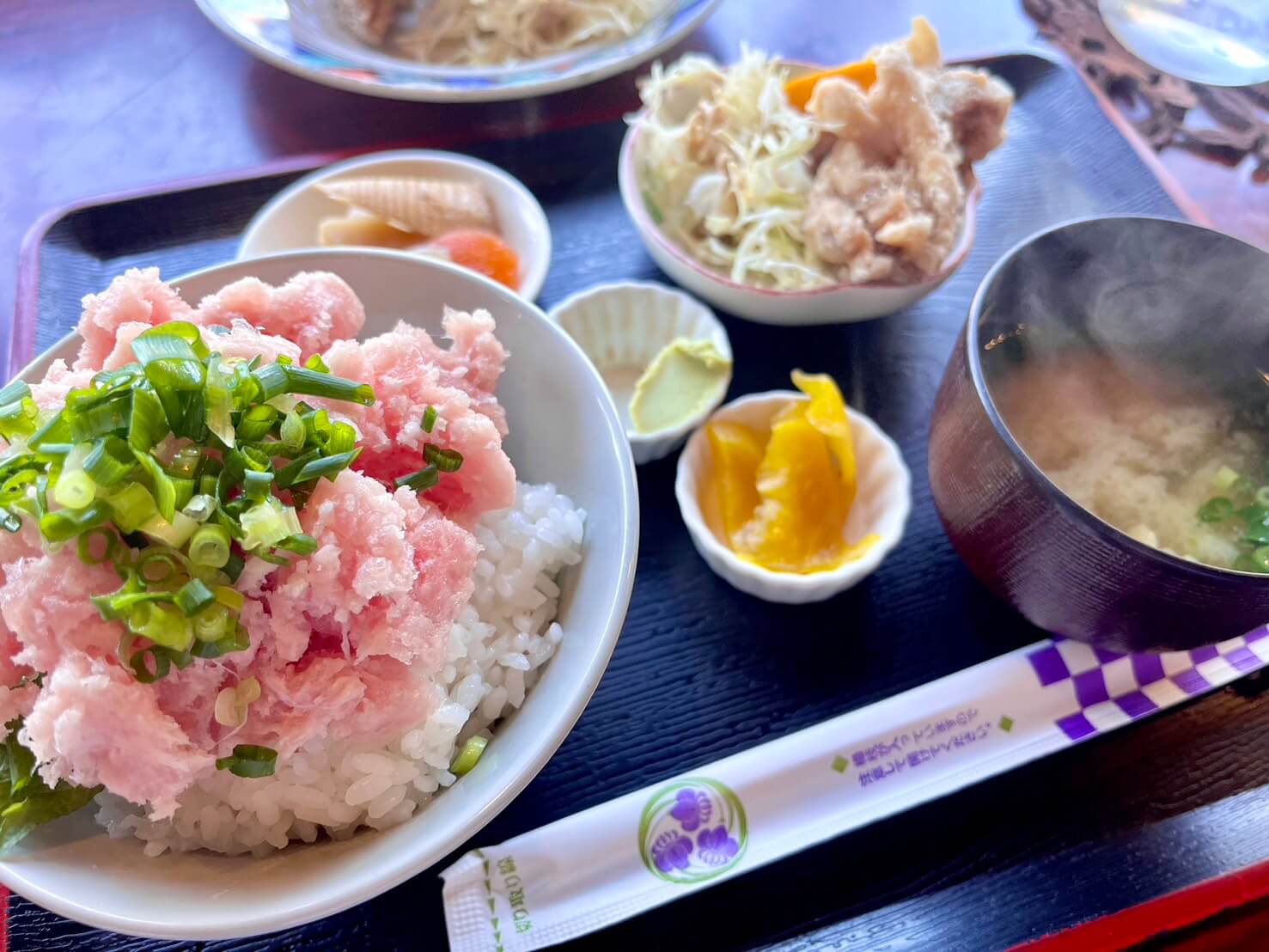 Includes negitoro bowl, salt-seasoned karaage, miso soup, small side dish, and pickles