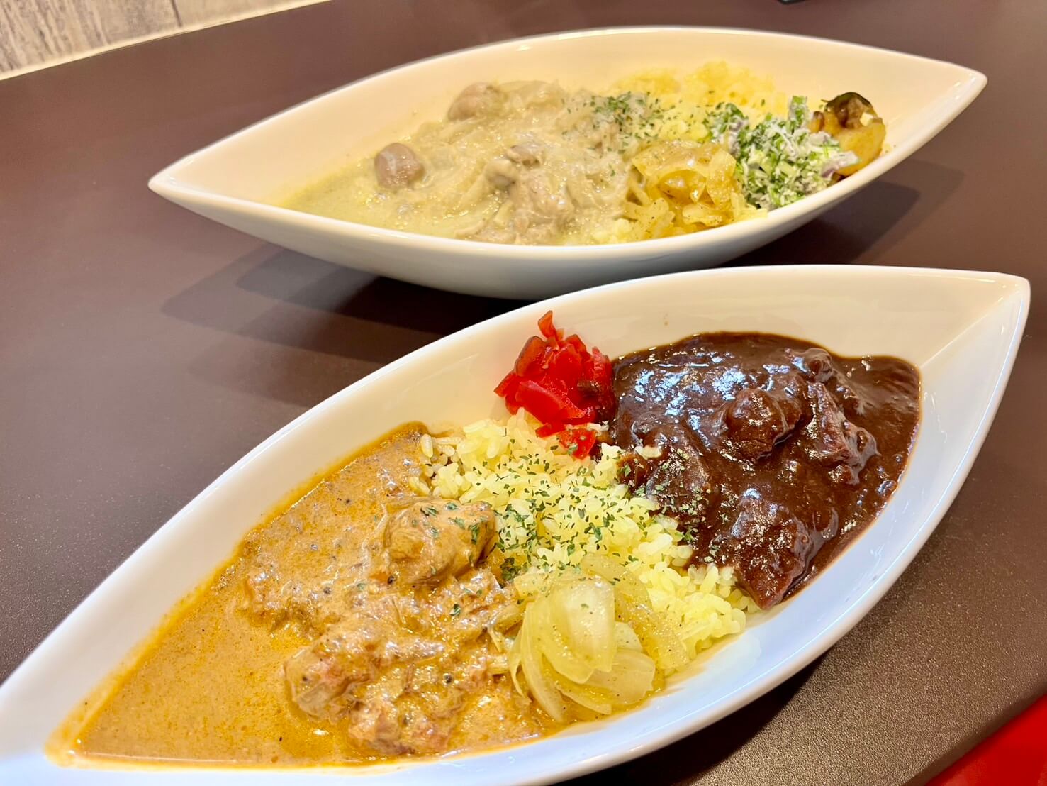 ă»Two-Curry Combo: Horse Tendon & Coconut Chicken Curry â 800 yen