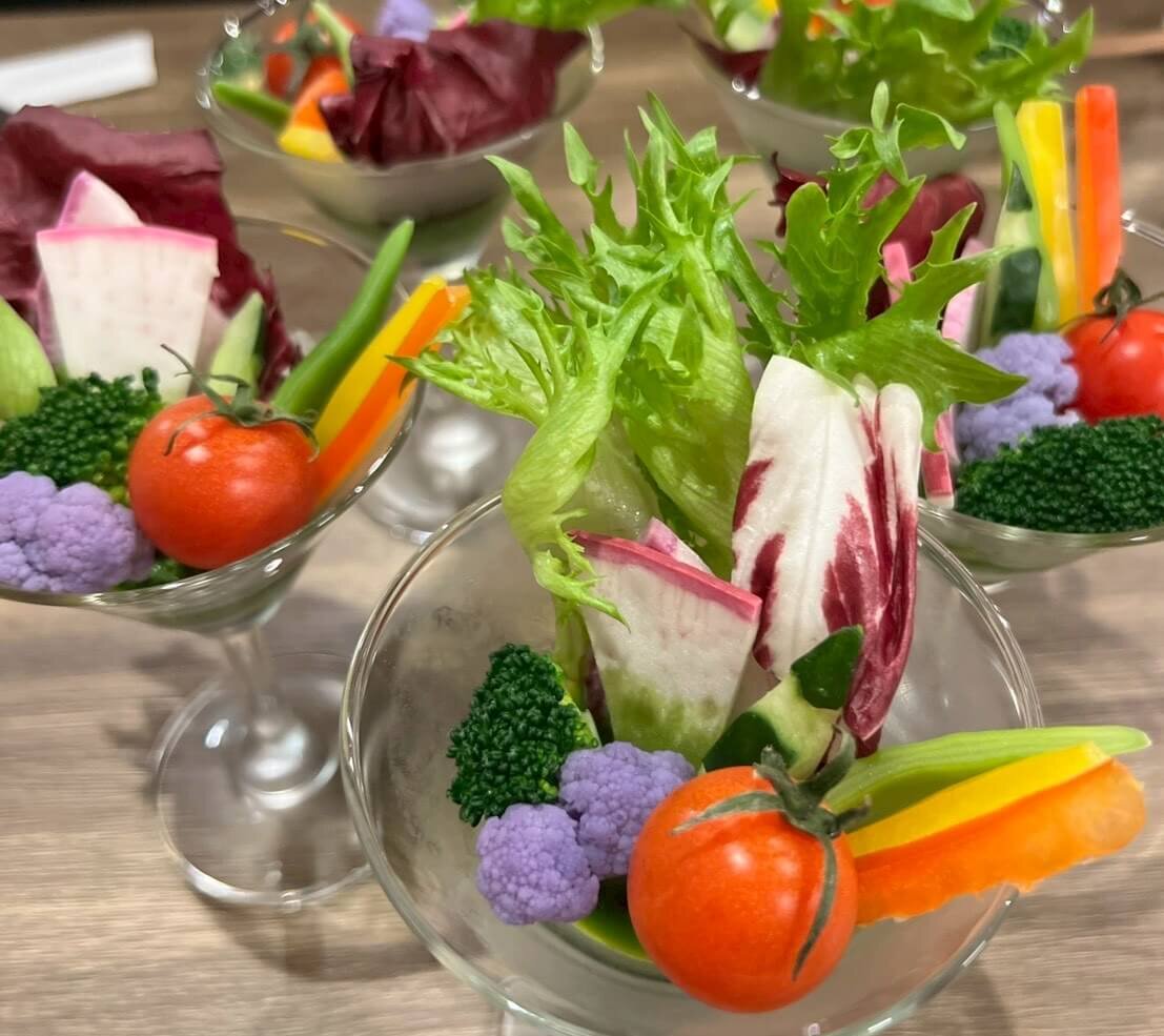 The cocktail glass is filled with a colorful arrangement of seasonal vegetables.