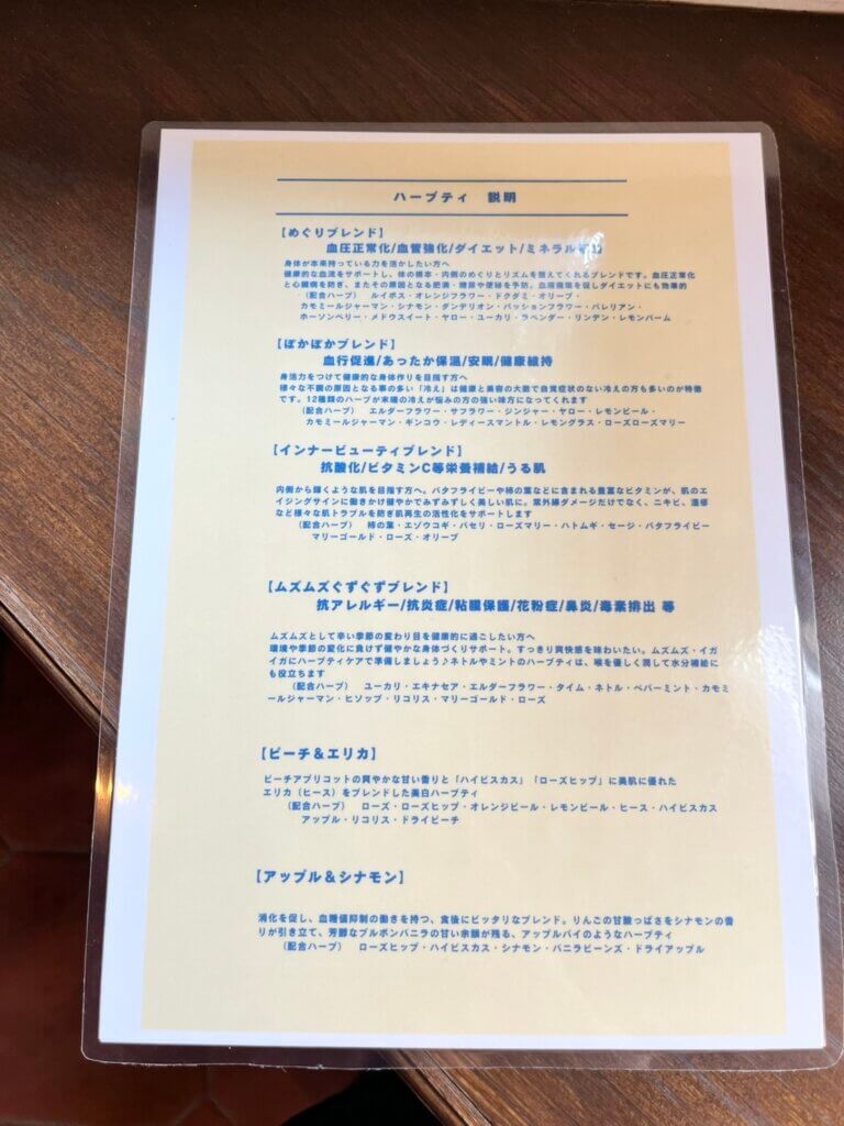 ハーブティーにも種類があるけど、何がどう違うの?という方は、メニュー表の裏をご覧ください♪