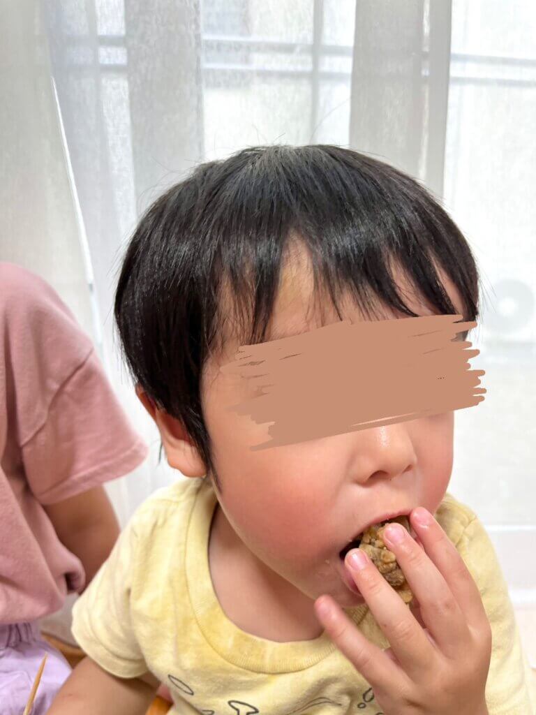息子にすぐ見つかり、あっという間にお口の中へ。