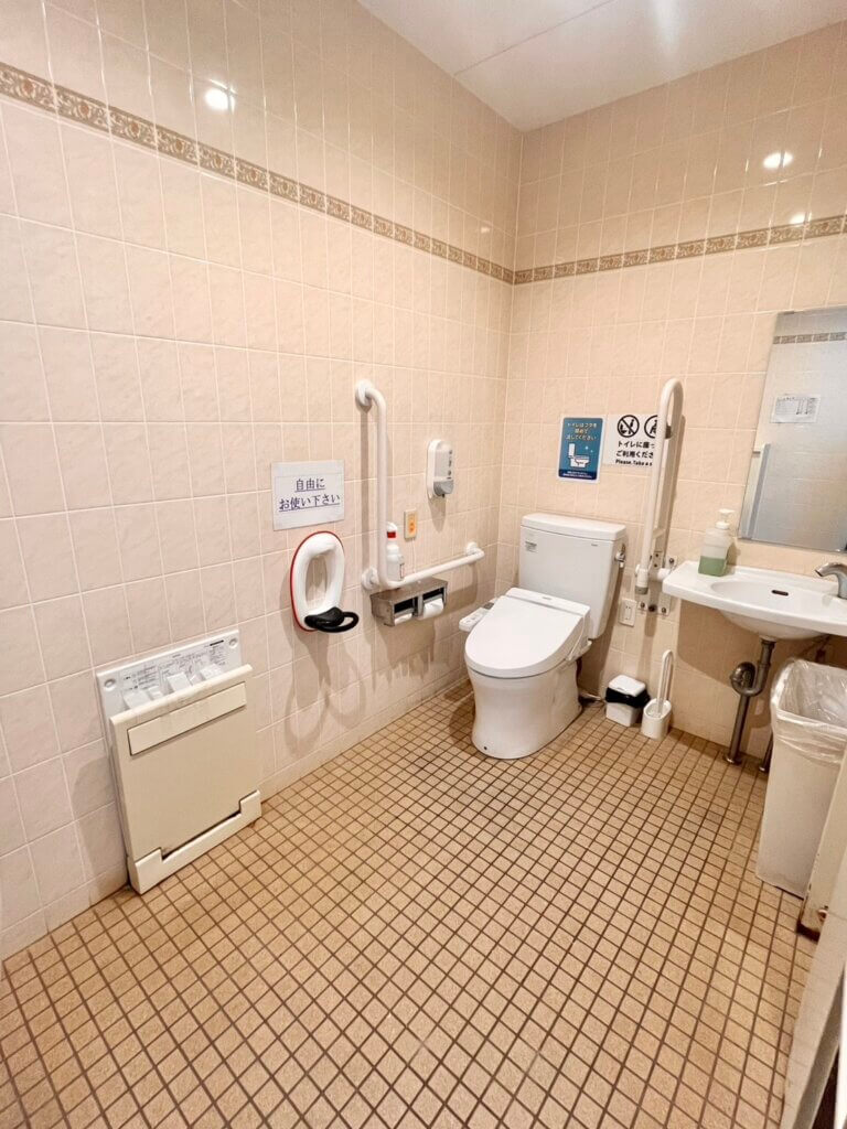 男女トイレ、多目的トイレがあり、多目的トイレには補助便座はありますが、オムツ交換台はありませんでした。