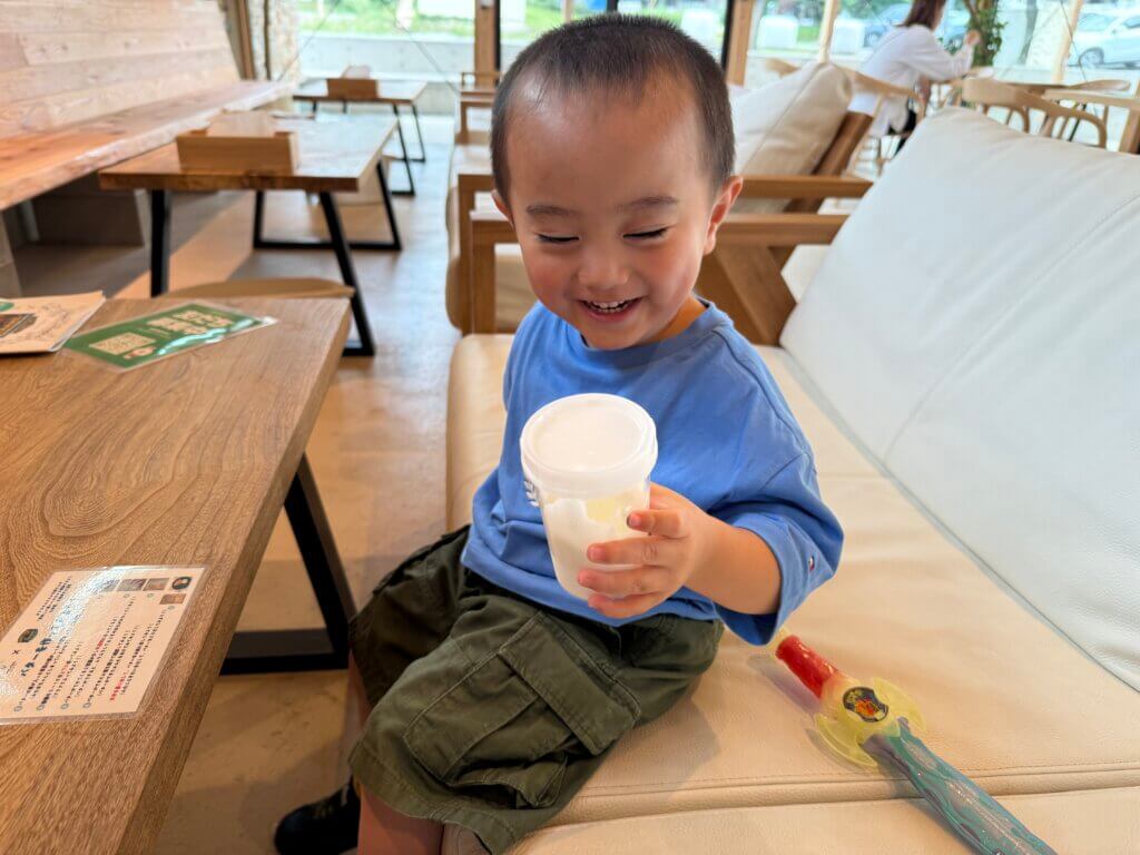 息子もヨーグルトを一口食べてこの笑顔。