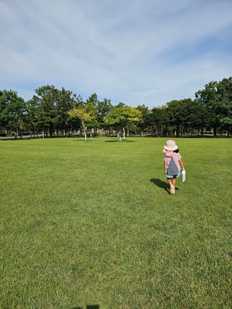 奥に大きな遊具が見えるけど、公園に入ってすぐは気持ちの良い芝生広場が広がっていて、屋根付きの休憩スペースもあります(^^)