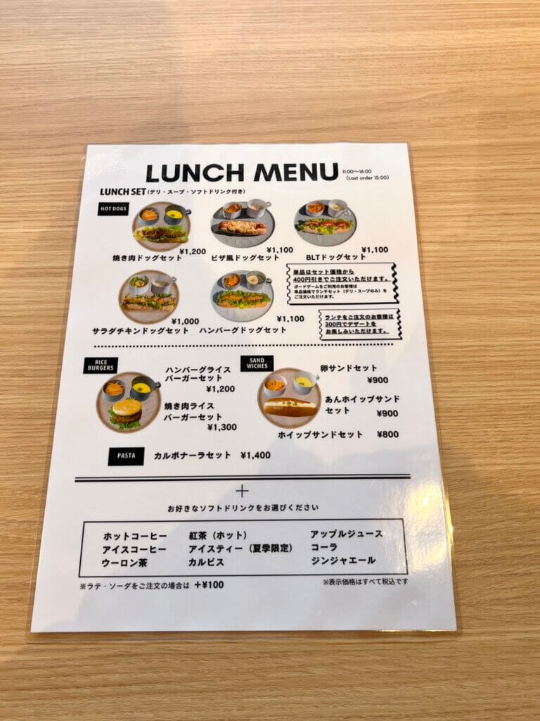 例:焼き肉ドッグセット(ボドゲ利用あり)→800円(焼き肉ドッグ、デリ、スープ)