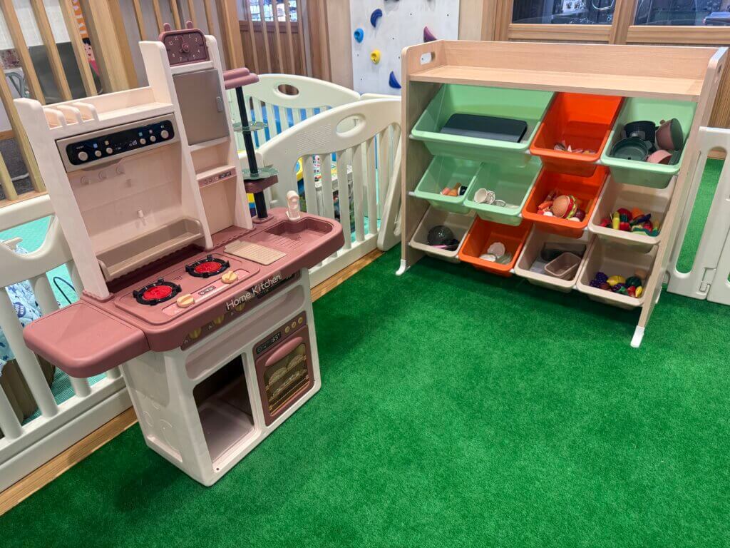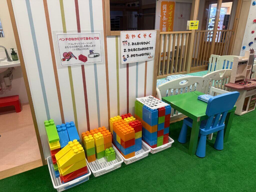 おもちゃスペースとアスレチックスペースの間はベンチで仕切られているので安心して遊ぶことができます^^