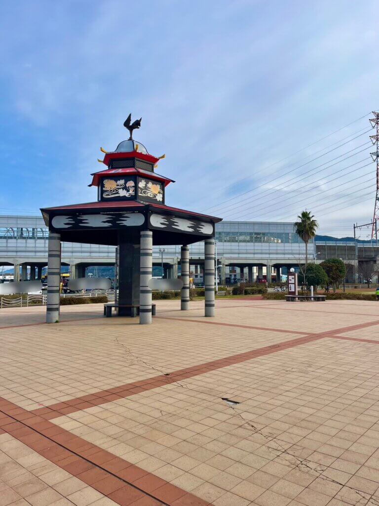 ユネスコ無形文化遺産に登録された、妙見祭の笠鉾(かさぼこ)をイメージした休憩所。