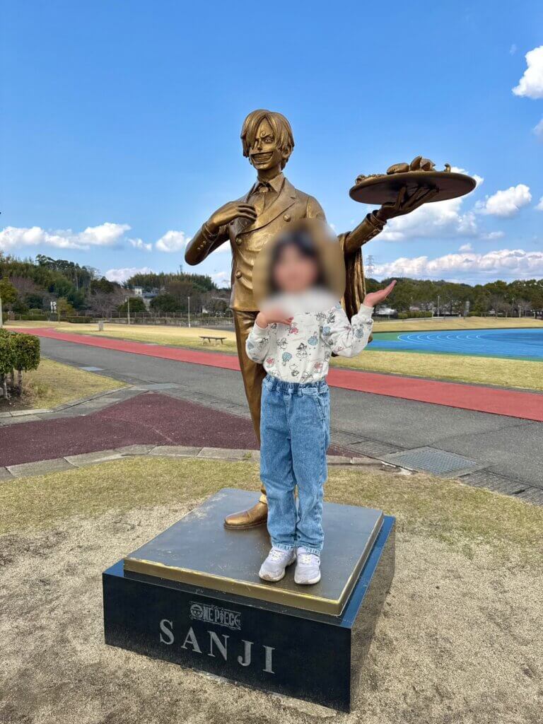 ワンピースのサンジ像がある、益城町総合運動公園。
