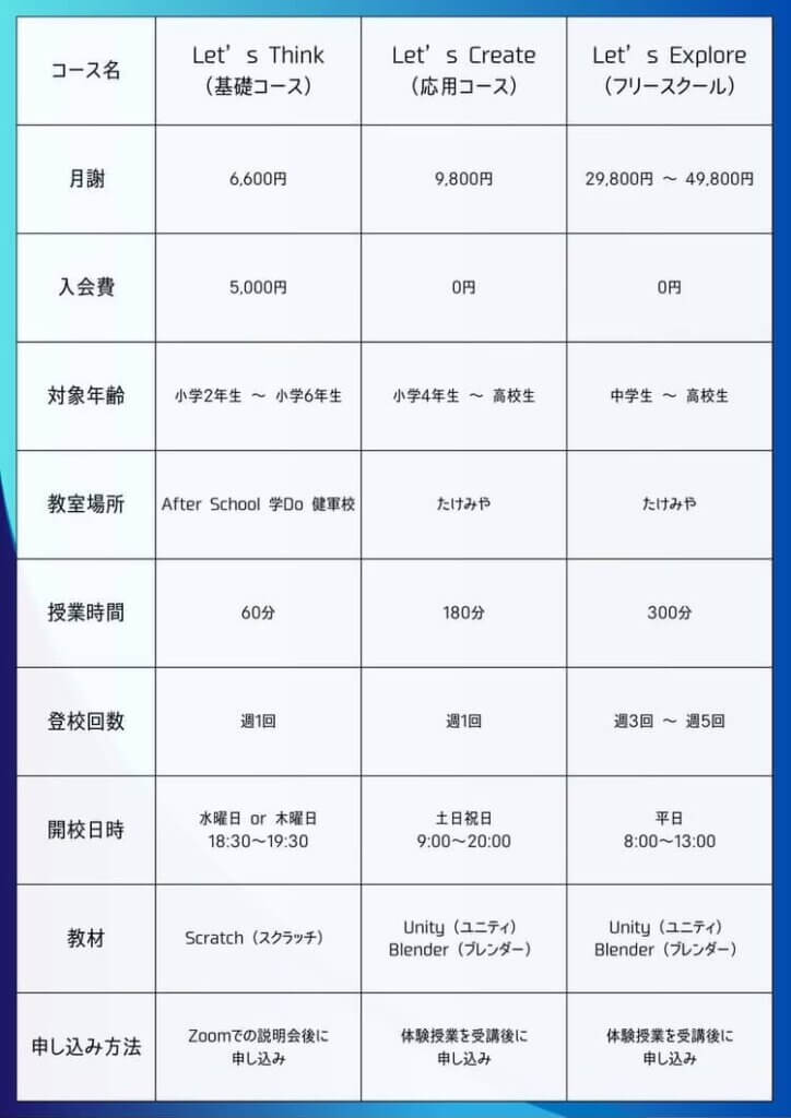 初心者から学べるプログラミング教室であり、中高生向けのフリースクールとしても運営されています。